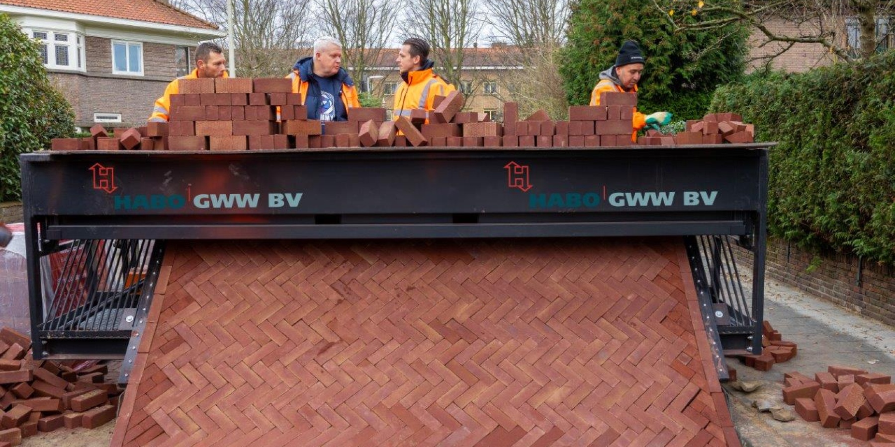 Onlangs hebben we in de Schoutenstraat in Den Haag een pilot gedraaid met het gebruik van een Roadprinter. Al sinds jaar en dag voeren wij de klinkers in machinale legverbanden aan en brengen wij de verharding aan middels een machinale klem. Deze methode zorgt ervoor dat klinkers in handmatige pakketten naar het werk gebracht kunnen worden.
