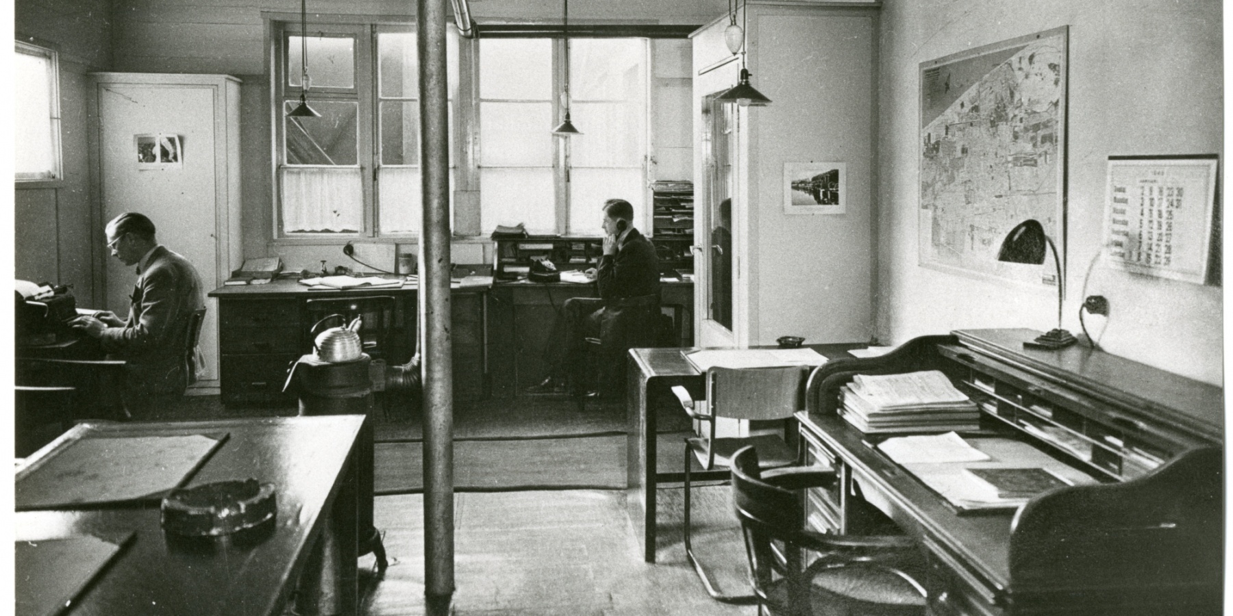 In het kader van throwback thursday een mooie foto uit onze rijke historie. Deze foto is afkomstig uit de collectie van het Haags Gemeentearchief, gemaakt door Thuring Fotoburo in circa 1945. De foto laat het interieur zien van het kantoor van HABO (Haagse Bouwmaatschappij), toen nog gevestigd aan de Ruijterstraat 48 in Den Haag. Erg leuk om te vergelijken met een werkplek anno 2019 op ons HABO-kantoor! In deze 75 jaar is er enorm veel veranderd in het werk op kantoren. Toch zien we ook een duidelijke gelijkenis: de kaart van Den Haag en een kalender boven het bureau.